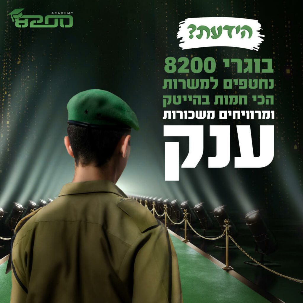 בעולם שבו ההתקדמות הטכנולוגית משחקת תפקיד הולך וגובר בחיינו, חיוני ואף הכרחי לעשות הכל על מנת להיות חלק מההתקדמות הזו. 8200 אקדמי, ארגון מוביל בחינוך טכנולוגי, גאה להכריז על שיתוף הפעולה עם החברה למתנ"סים, במטרה להביא חדשנות, ידע והזדמנות למרכזים קהילתיים ברחבי הארץ. אז אם 8200 זה החלום שלכם? זה לגמרי המקום בשבילכם!